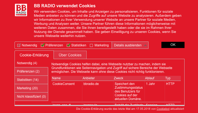 Konkret arbeiten wir auf unserer Webseite www.bbradio.de mit den folgenden Cookies zu den nachfolgend aufgelisteten Zwecken: